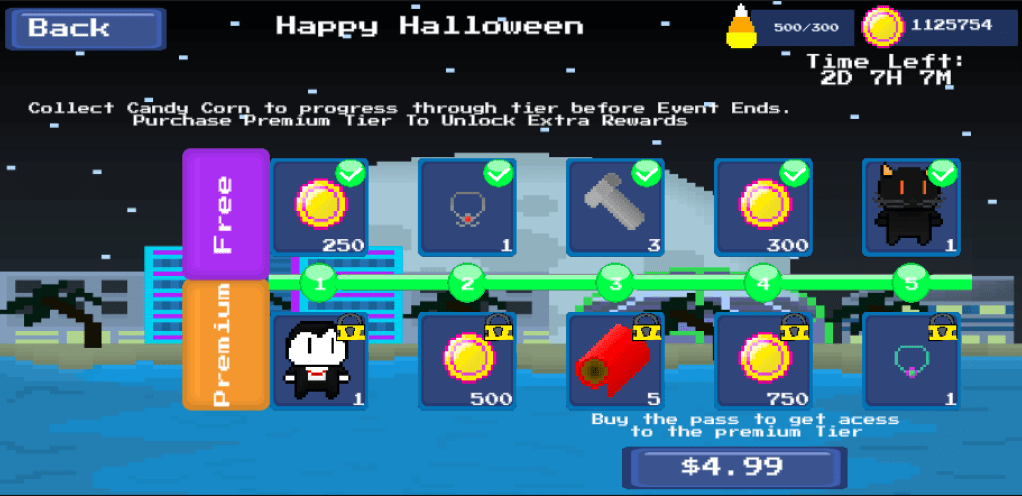 New Event Type the Festival which has 2 Tiers. Both tiers include exclusive items to the event. Collect special event currency from Levels, or buy it from the Penguin Vendor Buy the Premium Pass to gain access to exclusive rewards that currently remain exclusive to the pass, make sure to get them while you can. This update will feature 2 Events: Halloween and Black Friday Festival.