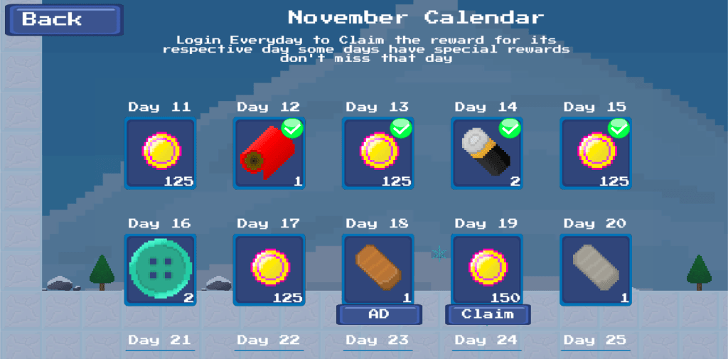 New Daily Login System As Been added in. Login In everyday to claim special rewards It is not streaked based but based on the day you login in you can watch an AD to claim previous days reward if you miss it every month has some special days where you can earn new Skins, Back Items, or Neck Items. Make sure to check the calendar. Most Days you will get crafting items and Tokens.
